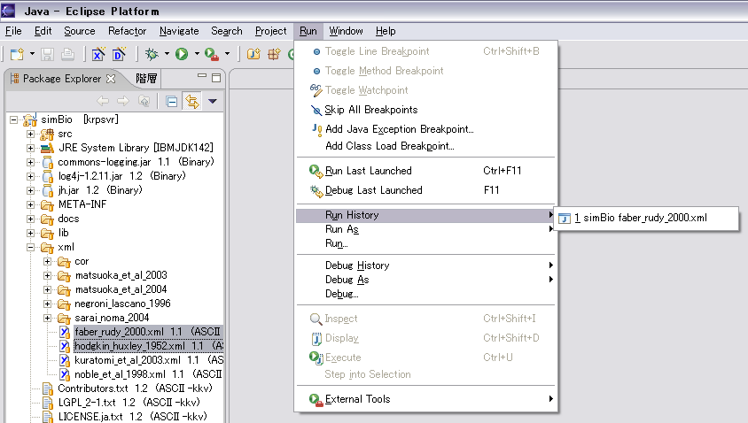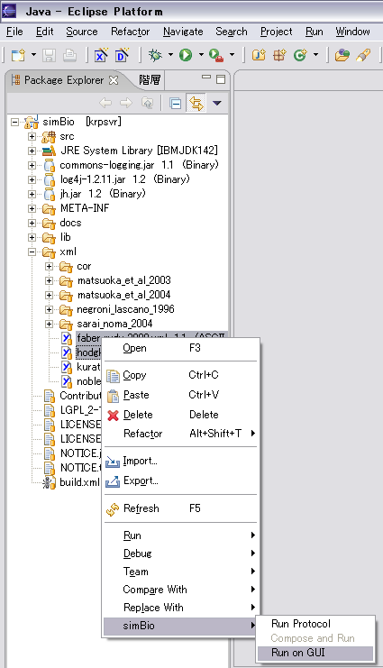 Execute simBio through pop-up menu of Eclipse Java Perspective. RunGUI, Composer, ResultGenerator, and XmlGenerator can be launched.